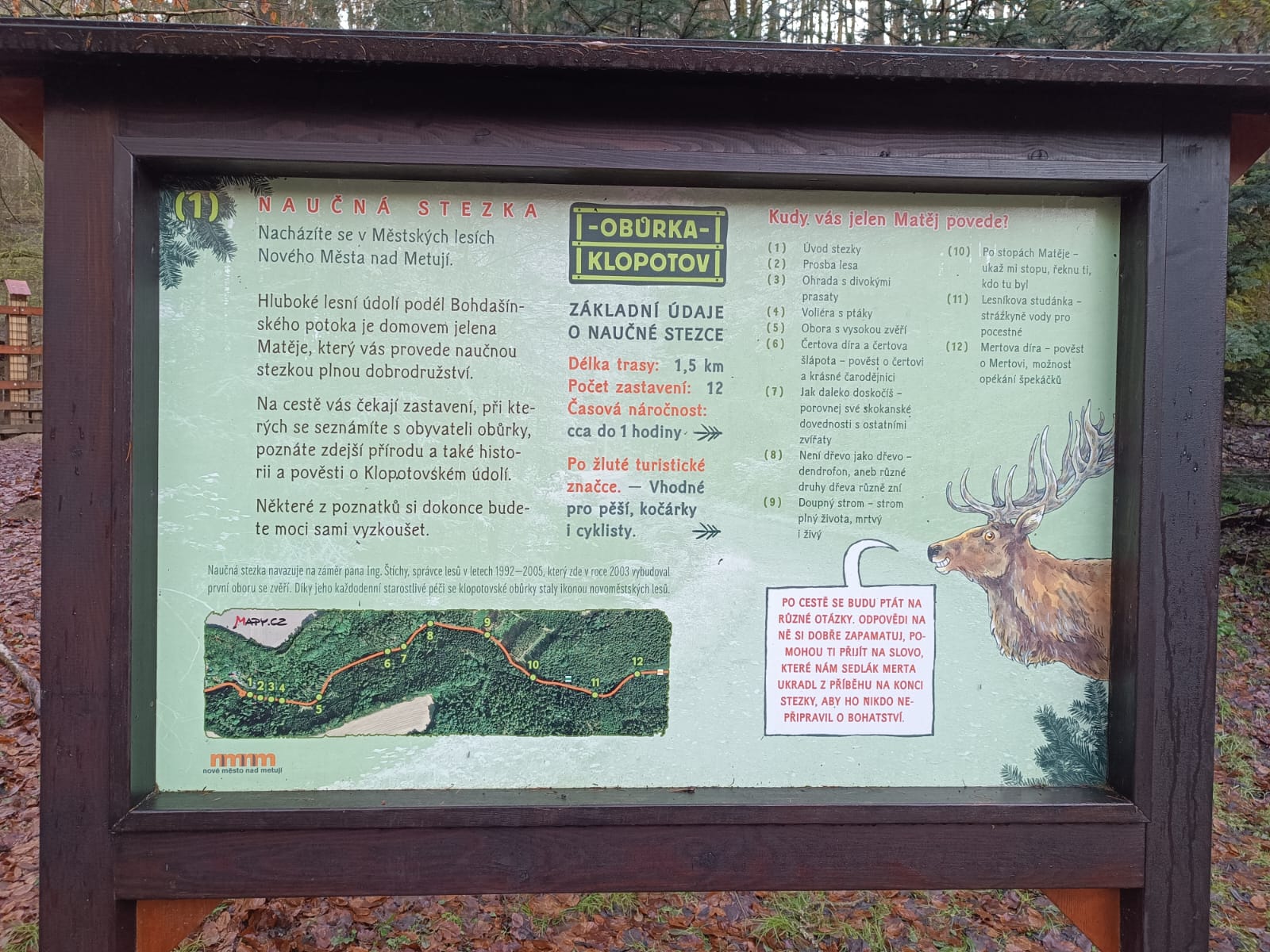 První zastávkou bylo Klopotovské údolí v Novém Městě nad Metují, které je ideálním místem pro odpočinek i nenáročné procházky. Cestou mezi skalami, potoky a bujnou zelení tu můžete narazit i na zvířata v místní oboře – volně tu žijí jeleni, daňci i mufloni. Klopotovské údolí je oblíbeným výletním místem pro rodiny s dětmi i milovníky přírody.
